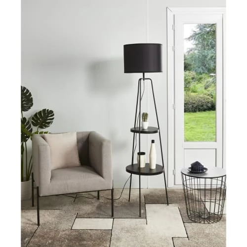 Maisons Du Monde Lampadaires Lampadaire En Bois Noir, Gris Et Beige, Abat-jour En Lin H154